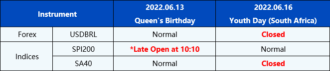 Please be advised that the following instruments’ trading hours and market session times will be affected by the upcoming Queen’s Birthday and Youth Day holidays.