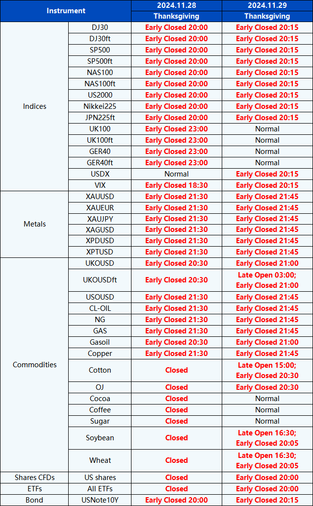Please be advised that the following instruments’ trading hours and market session times will be affected by the upcoming Thanksgiving holidays.