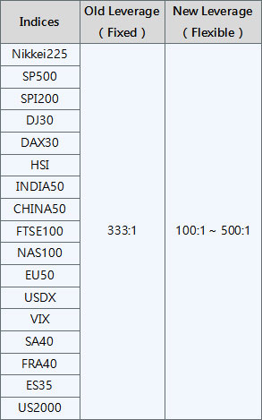 Please be aware that the leverage adjustment of Indices products would follow your account leverage settings. If your account leverage is set at 100:1, the adjusted Indices products leverage will be 100:1; if your account leverage remains at 500:1, the adjusted Indices products leverage will be 500:1. We strongly recommend clients to review their account leverage settings before 1st November 2021, assess risk tolerance, ensure sufficient funds are available their account and trade cautiously.