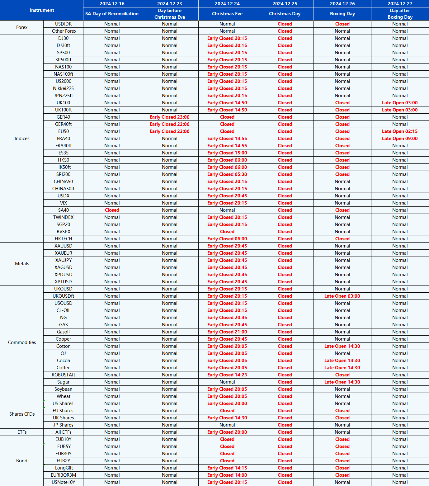Please be advised that the following instruments’ trading hours and market session times will be affected by the upcoming December holidays